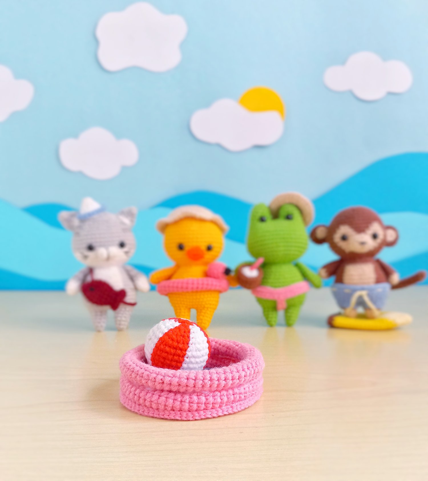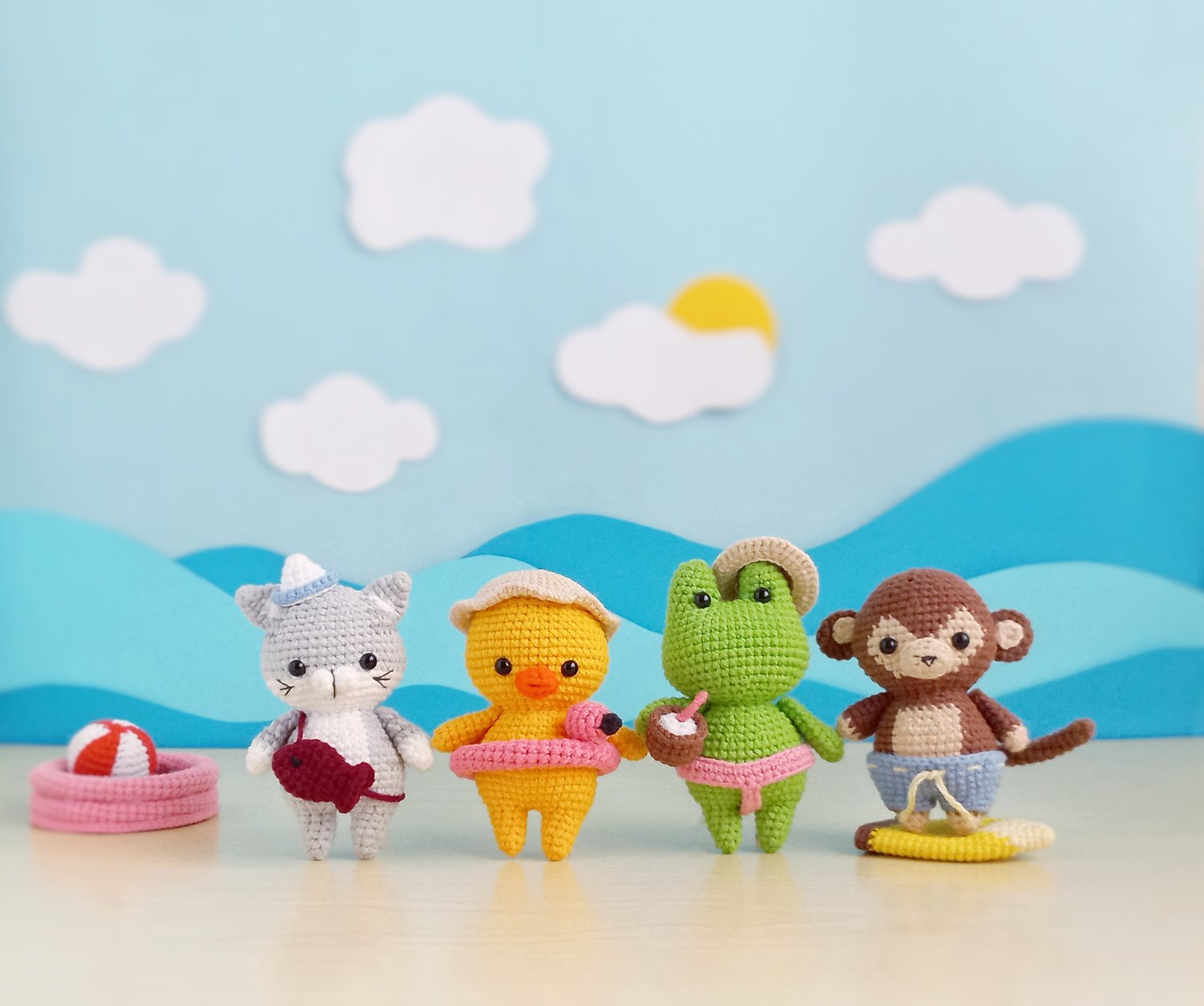 This summer minis crochet pattern bundle will be your perfect guide to making the cutest chill animals for the season. this bundle includes : Frog, Cat, Monkey, Chick and swimming pool pattern tutorials.