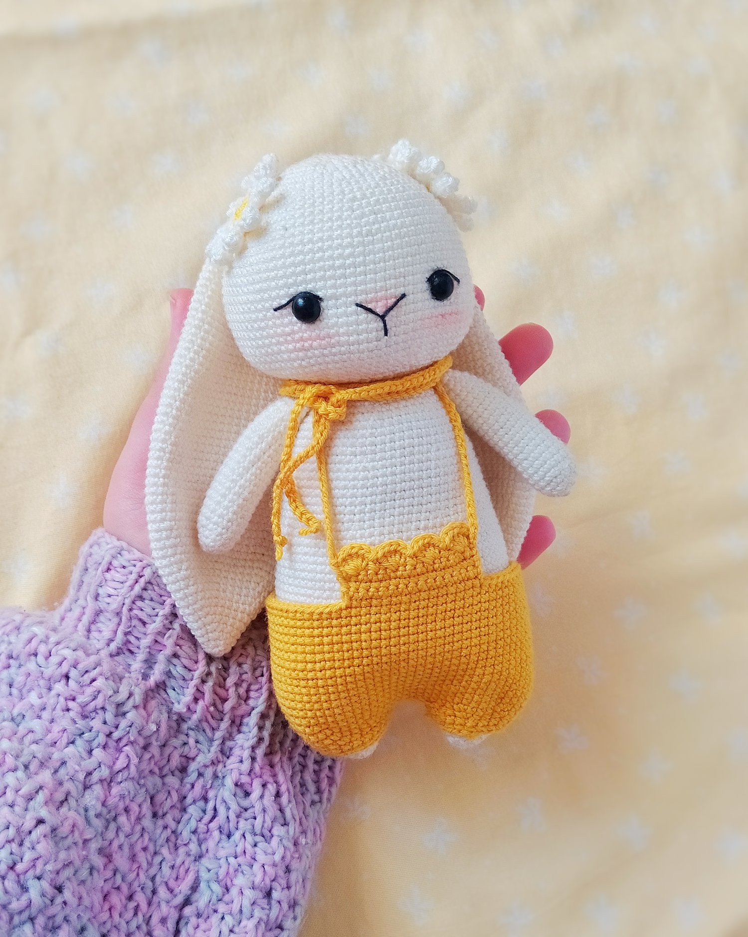 The PDF includes the pattern of the bunny and her outfit. The outfit is changeable so you can make one amigurumi and different outfits in different colors and change between them